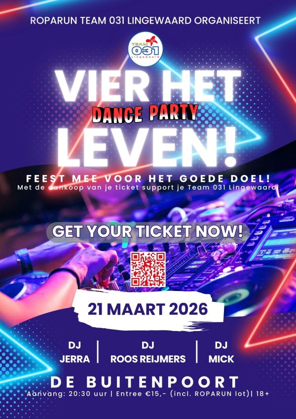Roparun team 031 Lingewaard organiseert “Vier het Leven” danceparty. Doel is, om geld in te zamelen voor de goede doelen van Stichting ROPARUN. Het bedrag van jouw entreeticket (€ 15,- inclusief 1 ROPARUN-lot) gaat rechtstreeks naar ondersteunende zorg voor mensen met kanker. HOE MOOI IS DAT!?